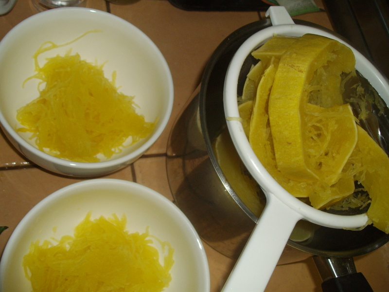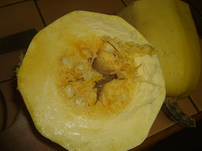 My only instructions were to cut it up and boil it until it was soft and then scrape the strands of "spaghetti" out of the skin. A google search reveals that there are a number of other methods, but this seemed pretty simple. We only used half the squash for the first night, and I can report that it has a ridiculously tough skin to cut through, I had to enlist the help of my husband to cut it up! Much like when we make pumpkin soup. I boiled it for about about 15 mins in lightly salted water, and it then became clear that the strands could be scraped from the skin.