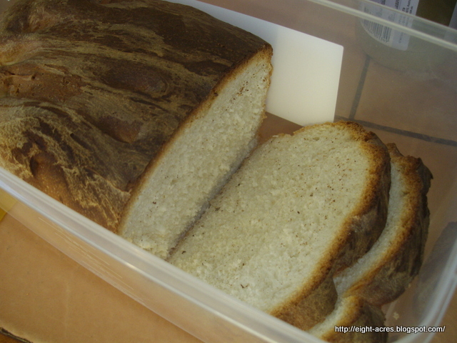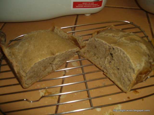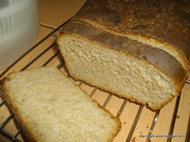 Finally, we tried a compromise loaf. This is a soaked flour wholemeal/white loaf that uses bakers yeast (from a free ebook that can be downloaded here). The flour and water (and honey and olive oil) are mixed with a little whey (I use kefir or yoghurt as well) 12 hours before baking and allowed to soak at room temperature. The bakers yeast and salt is added just before kneading and rising as per "normal" bread. I used the bread maker to mix the dough and baked it in the wood stove. The loaf was not as fluffy as the white one, but not as dense as the sourdough. It does have a slightly sour taste, but not as strong as the sourdough. I think its a delicious flavour and texture, and I think Farmer Pete is happy with it (he has been eating it, which is a good sign as he wouldn't eat the sourdough!).