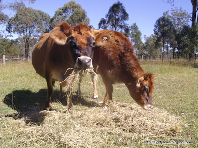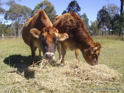 Bella also hates dogs. If the dogs come near her she will try to bunt them, and then chase them away. Even if they are just standing in the same paddock, she will try to chase them. Although I feel sorry for the dogs, who only mean well, it is reassuring to know that if any wild dogs or neighbour's dogs come into our paddocks, Bella will defend herself and her calf against them.