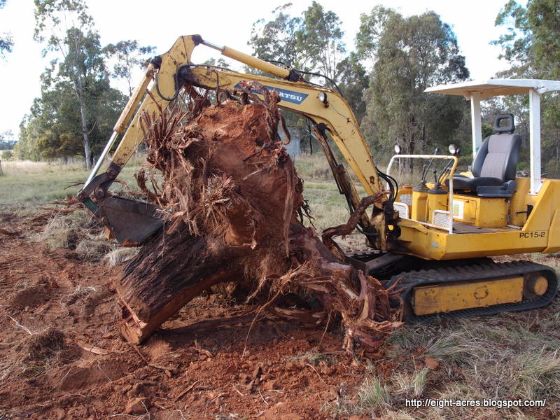 Our first big challenge was finding an earth-moving contractor to help us level the pad for the house. We had selected a site on top of a hill, which was relatively flat, however we needed four large Ironbark gum trees removed. We waited for several months for various earthmoving contractors to be available to help us, and eventually we cut down the trees ourselves, leaving only the stumps to be removed. Just in time we were able to find a small excavator operator, who worked all weekend to remove the stumps and clear the house pad for us. Peter had to use our tractor to smooth it out as best he good. The largest stump was bigger than the excavator!