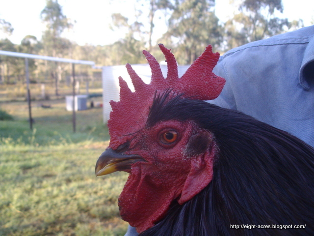 There are various methods involving pliers and even a hot potato, but our preferred method is to use the angle grinder. Although the noise is a bit scary, the process is very quick and the heat seals the spur so there is very little blood loss. Its easier with two people, one to hold the rooster (me) and the other to operate the power tool (Peter). I usually hold the rooster so that his head is under my arm, and his wings are secure, then Peter grabs the rooster's leg and holds that tight before quickly taking off the sharp point of the spur.