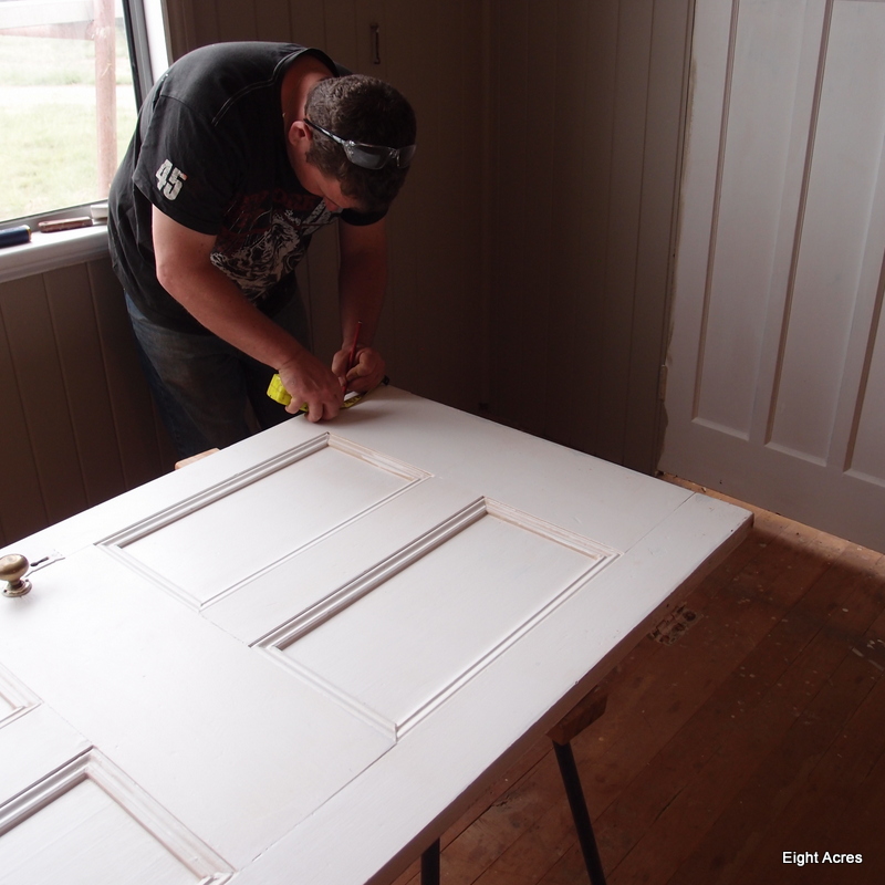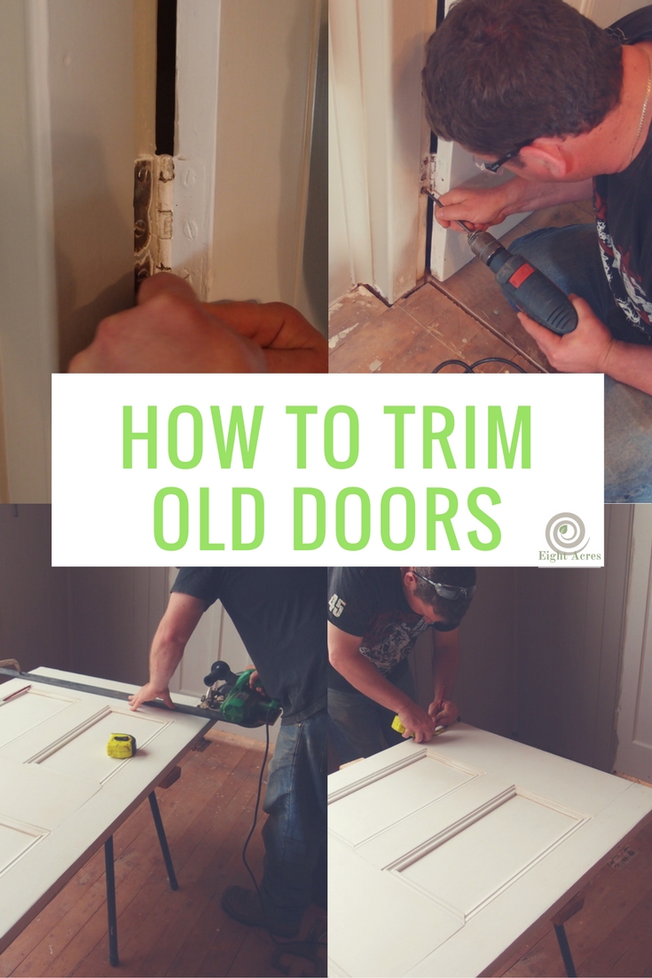 Without a door trimmer, our only other option was to take each door off its hinges, trim it and rehang it. We were not really keen on removing hundred year old doors, but we had no choice. Luckily it was easier than expected. First Pete cleaned the paint off each hinge using a wire wheel on an angle grinder. This made it easier to get to the screws, which he then removed with a battery powered drill.